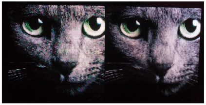 2. 雙鎖存產(chǎn)品部分照片沒有出現(xiàn)掃描線,說明刷新率足夠,但仍然出現(xiàn)了嚴(yán)重的顯示失真(如圖二,圖六)