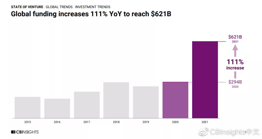 在各國央行史無前例的寬松貨幣政策與過剩的流動性趨勢下,疫情并沒有阻礙 2021 年風投腳步。2021 年全球融資達 6210 億美元,較 2020 年的 2940 億美元增長逾一倍。