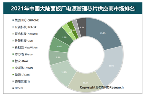 圖1:2021年中國(guó)大陸面板廠電源管理芯片供應(yīng)商市場(chǎng)排名,來源:CINNO Research