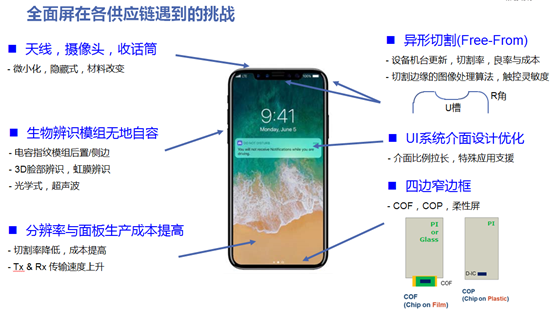 手機(jī)產(chǎn)業(yè)鏈正面臨全新的挑戰(zhàn),包括設(shè)計、制造以及工藝上的種種難點。具體問題如:聽筒、前置攝像頭的位置如何重新規(guī)劃,如何解決正面生物識別的問題,如何應(yīng)對面板因切割率降低而產(chǎn)生的成本問題,如何解決異型切割問題……凡此種種,是整個供應(yīng)鏈需要面臨的共同挑戰(zhàn)。
