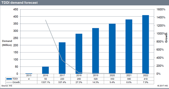 過去因 TDDI IC 單價偏高,導(dǎo)致整體 In-Cell 面板模組報價居高不下,但隨著面板廠與 IC 設(shè)計廠商持續(xù)針對產(chǎn)品進(jìn)行優(yōu)化,TDDI IC 降價速度加快,也可望加速提升整體 In-Cell 的滲透率。預(yù)計 2018 年, In-Cell 方案的滲透率將達(dá) 37.6%,其中搭載 TDDI IC 的 In-Cell 產(chǎn)品比重也有機(jī)會提升至 22%。